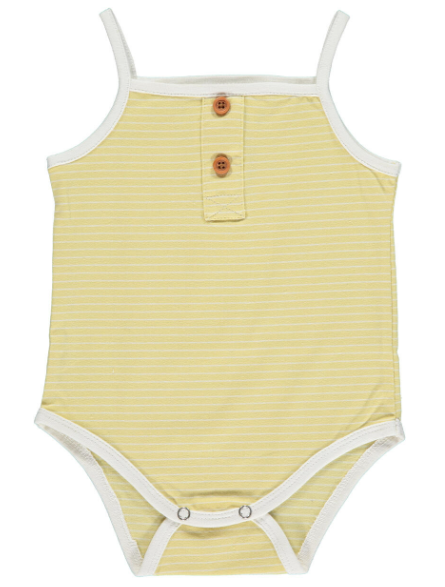 Get cozy in our super soft Butter Yellow Onesie! Its trendy stripes and easy snap bottom make for quick diaper changes. Pair it with our butter yellow bloomers for a sweet outfit that'll make your baby girl the talk of the town.
