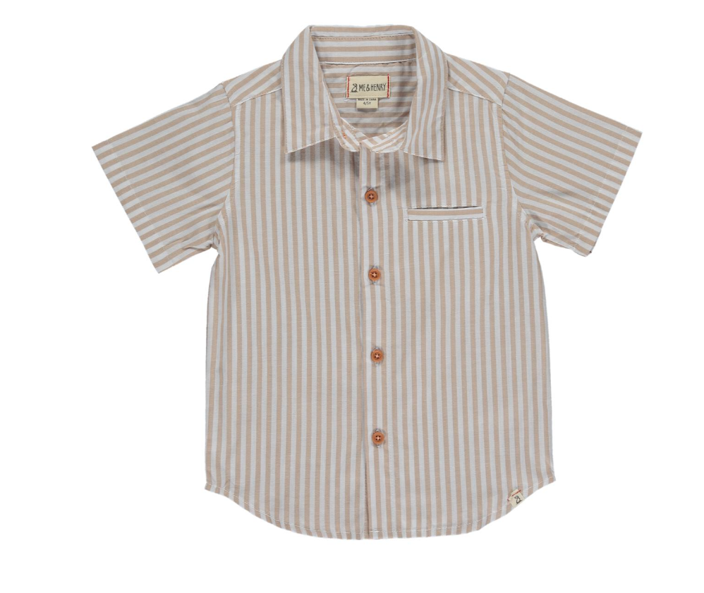 This boys' button down top with short sleeves is perfect for dressing up or down. The beige and white stripes add a unique touch. Great for any occasion!