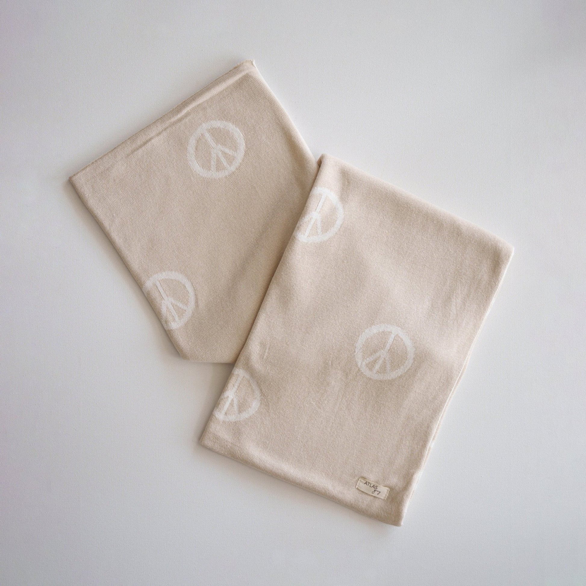 Calming and soothing, our peace blanket feels like a little hush, a tiny whisper and a loving lullaby. The soft knit is like wrapping up your baby in clouds. The blanket is enhanced with white peace signs printed all over. It is doubled lined and woven with a touch of warmth.