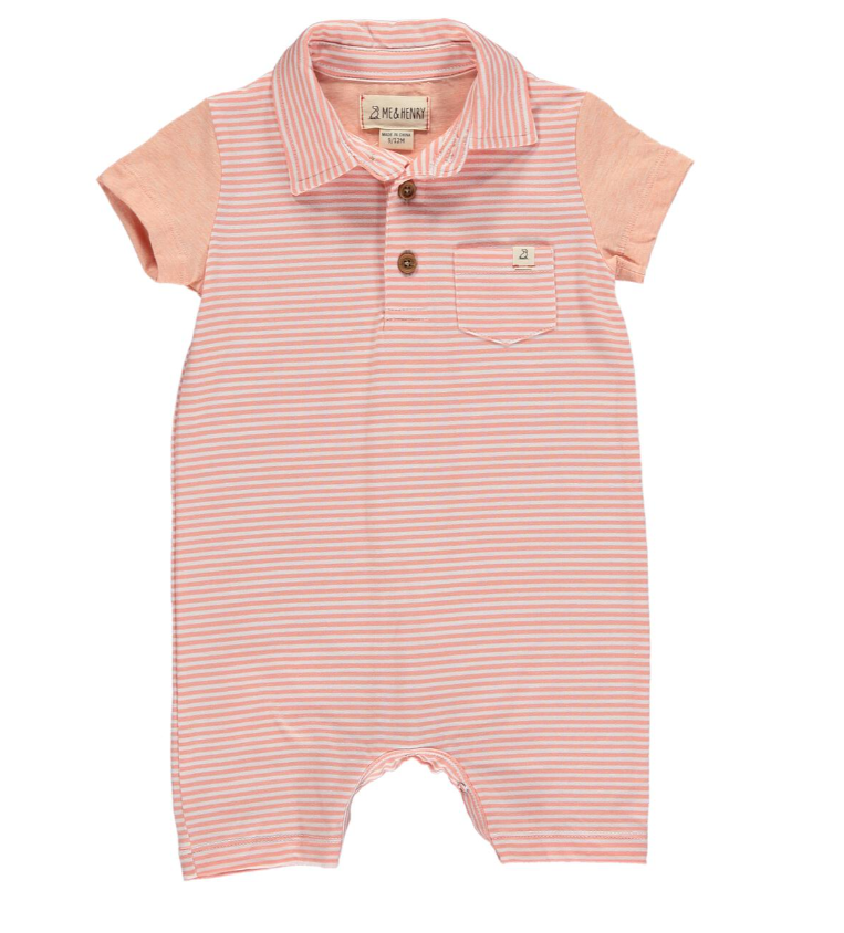 Pounce on this Peach Micro Stripe Polo Romper with playful pocket and button details! Perfect for a day under the sun, the peach and white stripes add a touch of fun to your outfit while keeping you stylish.